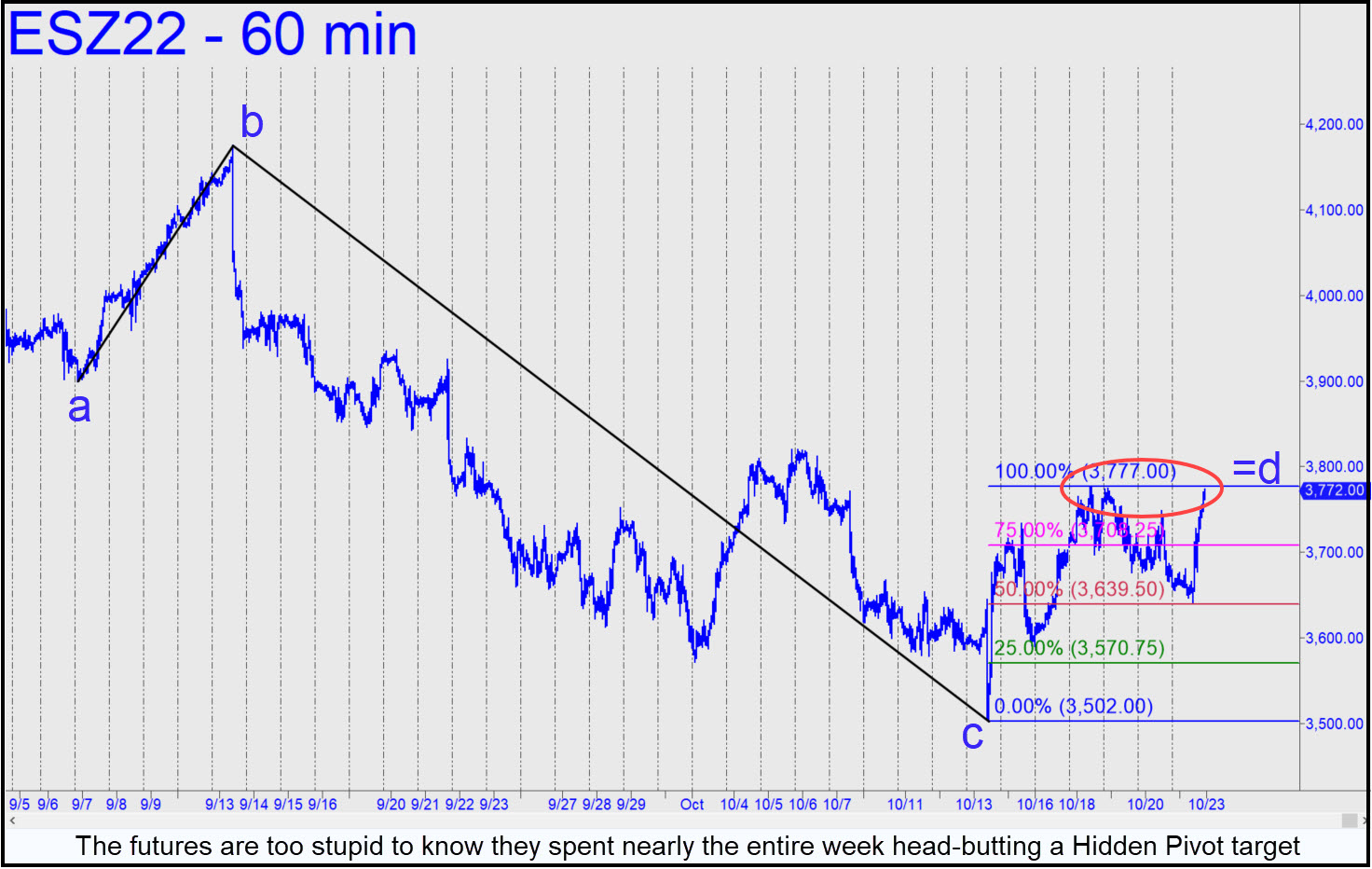 The seemingly strong rally that ended the week merely balanced out three days of bland weakness that had preceded it. In the S&P 500, the upthrust steepened by the hour but ultimately failed to surpass any important prior peaks. The bear seems out to challenge bulls and bears alike with its obviousness. For one, most of the larger trend moves of the past two months have been reversals off price spikes outside regular hours. And for two, middling ABCD patterns in stocks and futures are finishing at their 'D' targets with predictable regularity. That sums up last week's kabuki in the E-Mini S&Ps, when they head-butted the 3777.00 'D' target of a large 'reversed' pattern repeatedly, only to die a hair short of it at the bell.