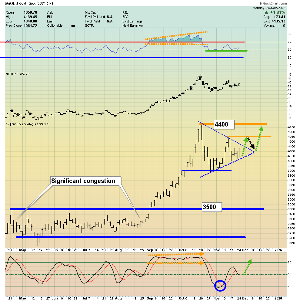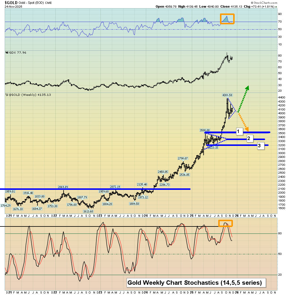 - Please click here now. Click to enlarge this weekly chart for gold. While oscillators like RSI are still overbought, actual “boots on the ground” investor sentiment seems quite calm.
