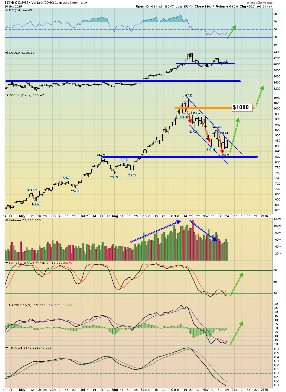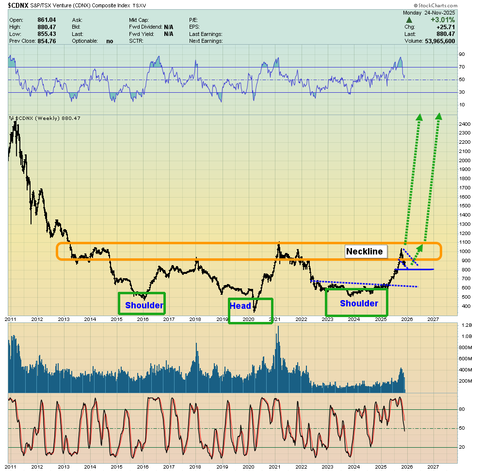 - Incredibly, the inverse H&S pattern on this chart is in perfect sync with the one on the CDNX chart. This kind of bullish synchronicity opens the door to much higher price scenarios…