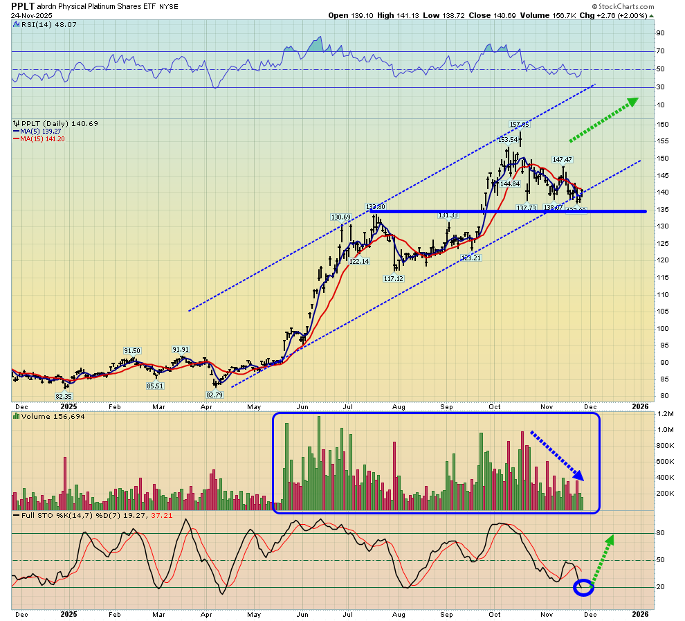 - Platinum (basis PPLT) looks like a freight train set to pull out of a train station. The pullback from about $157 to $133 has been accompanied by a nice fade in volume. The set-up for solid gains in the early months of 2026 is clearly in place.