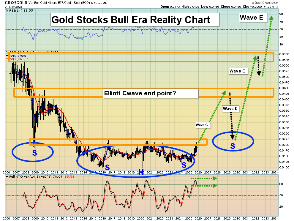 - Is the bullish action in the juniors confirmed by the seniors? Well, to view a key chart that supports this thesis, please click here now. Click to enlarge what is clearly one of the most enticing charts in the history of markets: the long-term GDX versus gold chart.