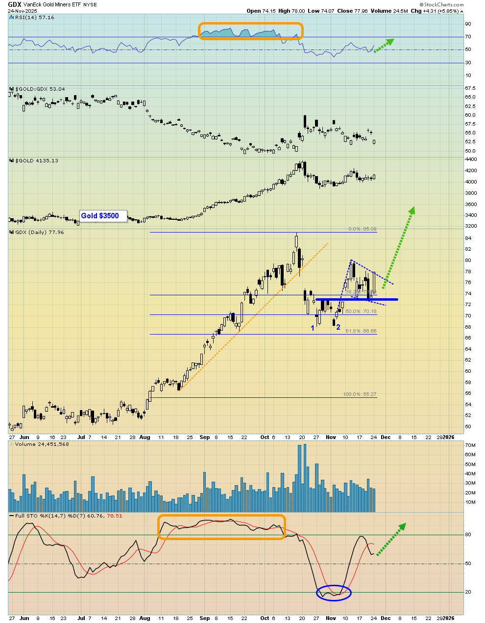 - Please click here now. Click to enlarge this GDX daily chart. Stochastics looks perky just above the 50 mark, and there’s a double bottom with a flag-like drift in play.