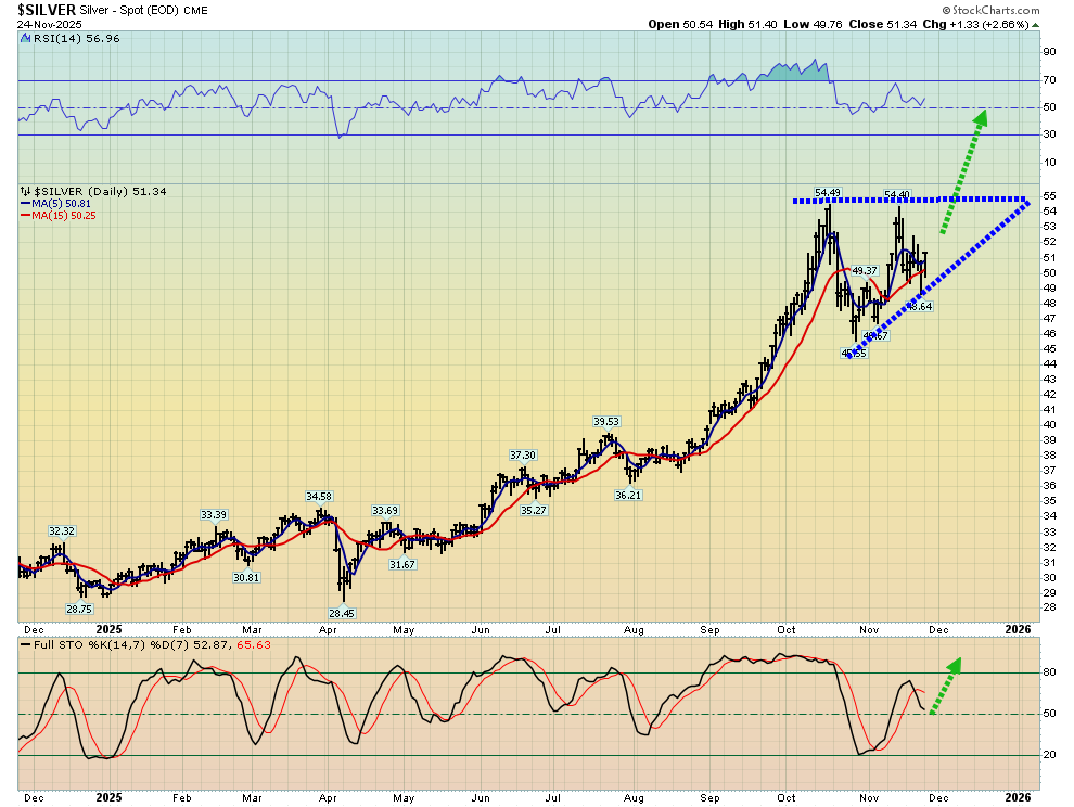 - Silver? Please click here now. Click to enlarge. As with gold, Stochastics and RSI are hovering nicely in the 50 zone.