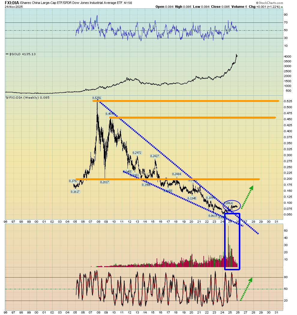 - Next, please click here now. Click to enlarge this stunning FXI versus DIA ratio chart. The Chinese government has engaged in ridiculous debt worship for a long time. That silly behaviour isn’t much different from the debt obsession showcased by the equally silly US government, but the power of the private sector in both nations needs to be respected.